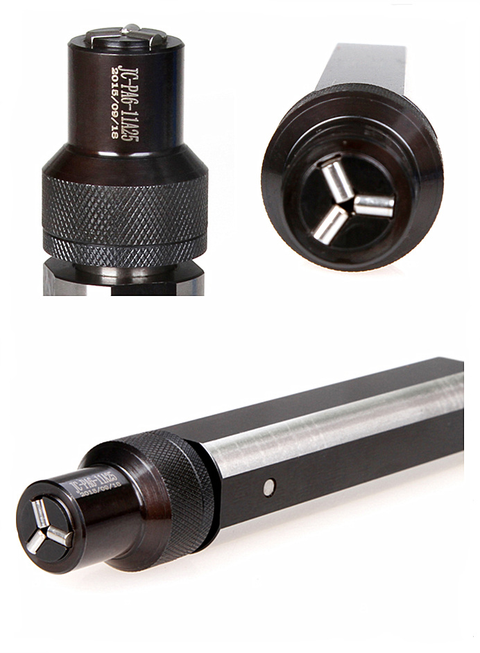 本工具壓力裝置設計在裝夾柄內部,可極大的縮短滾壓頭伸出距離,較適合有行程限制的機床上平面滾壓加工。